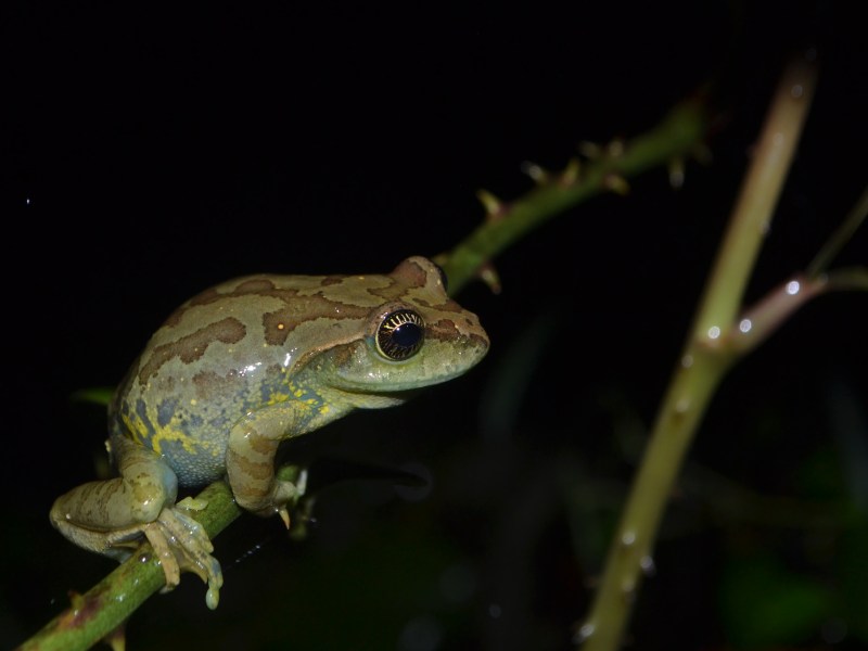 It was night and Vishnupriya, Rushi and I were walking along a coffee estate stream. We were surrounded by whistles, clicks, and croaks coming from the vocal sacs of bush frogs and gliding frogs. Conditions were perfect for herping—that is, there was a slight drizzle and leeches were numerous. Herping—an activity practiced by eccentric skulkers of the wildlife community—involves crawling about, often under cover of darkness, and cooing over such things as snakes, lizards, and frogs. It is a term derived from herpetology, the study of reptiles and amphibians.